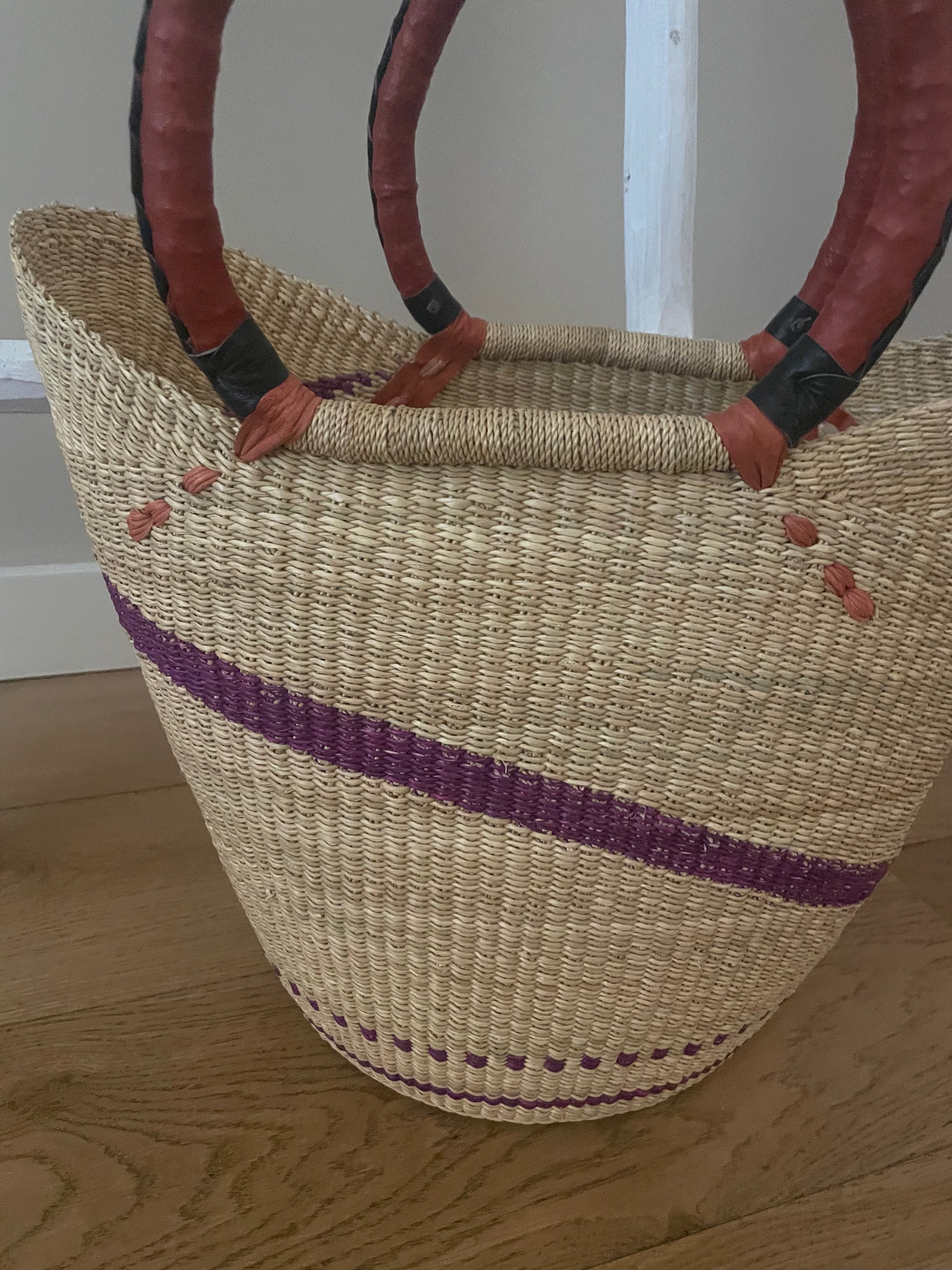 De mand is gevlochten van olifantsgras, wat zeer soepel, stevig en duurzaam is. Het handvat is afgewerkt met roodbruin leer met een zwarte bies.