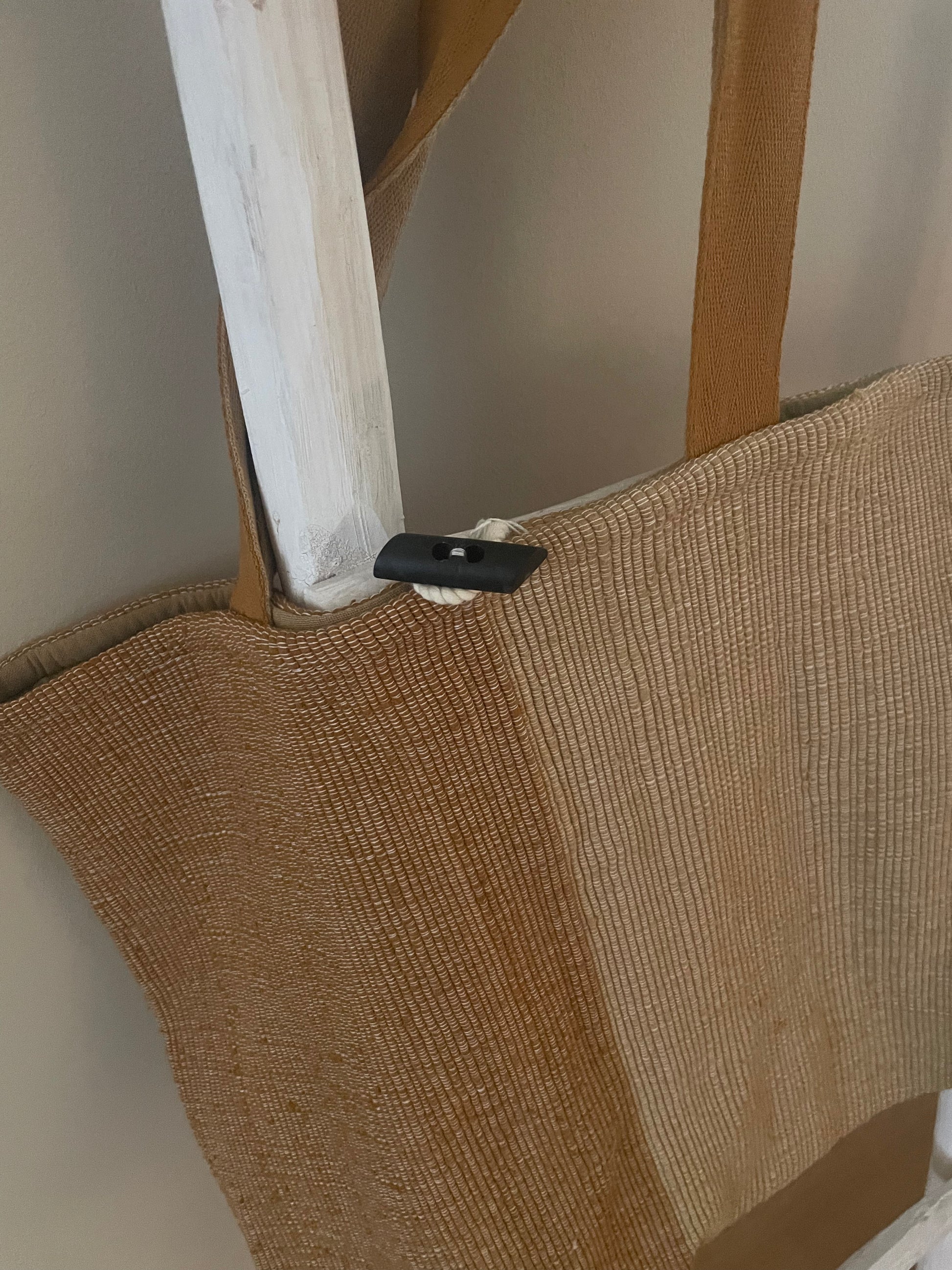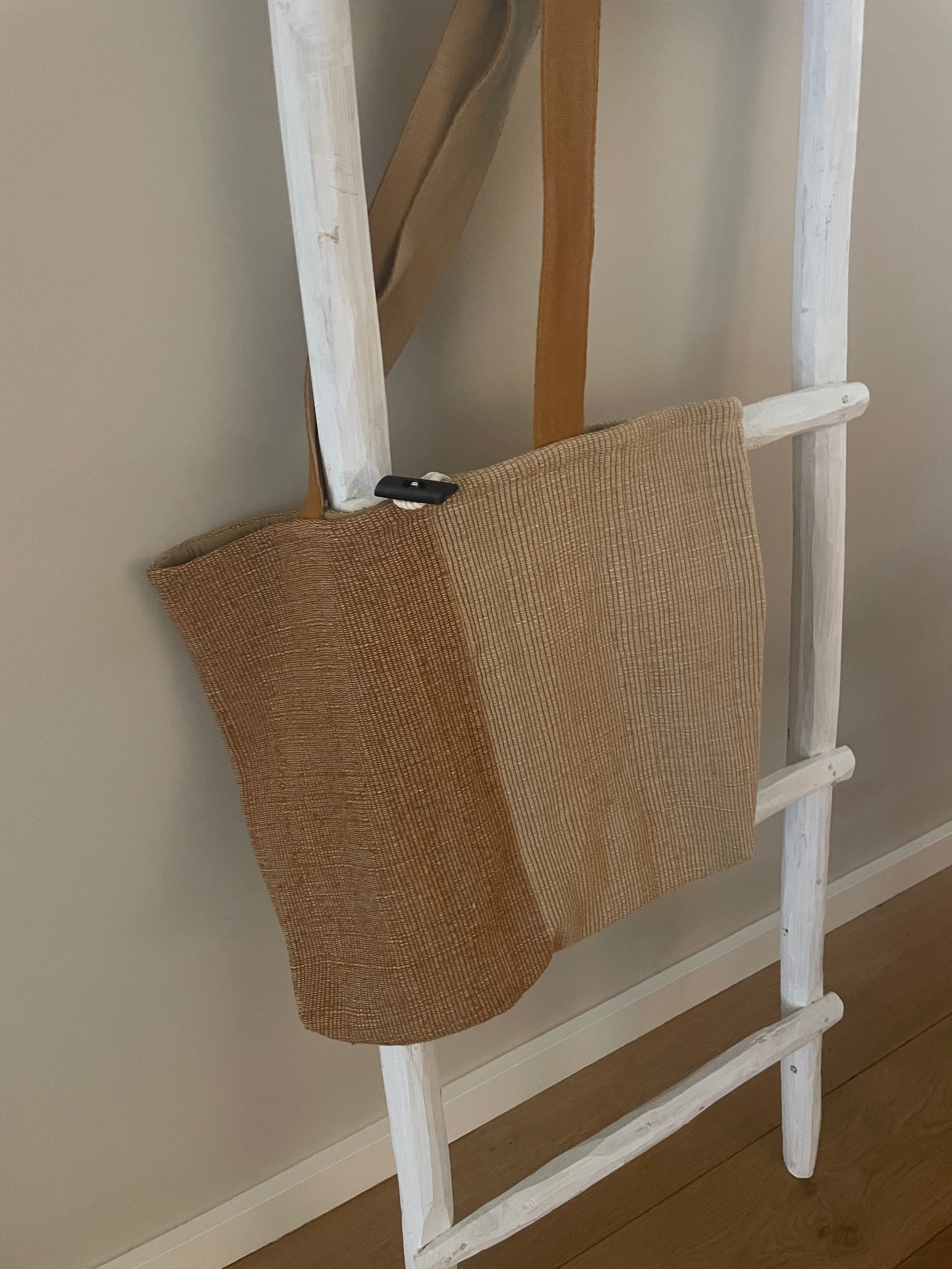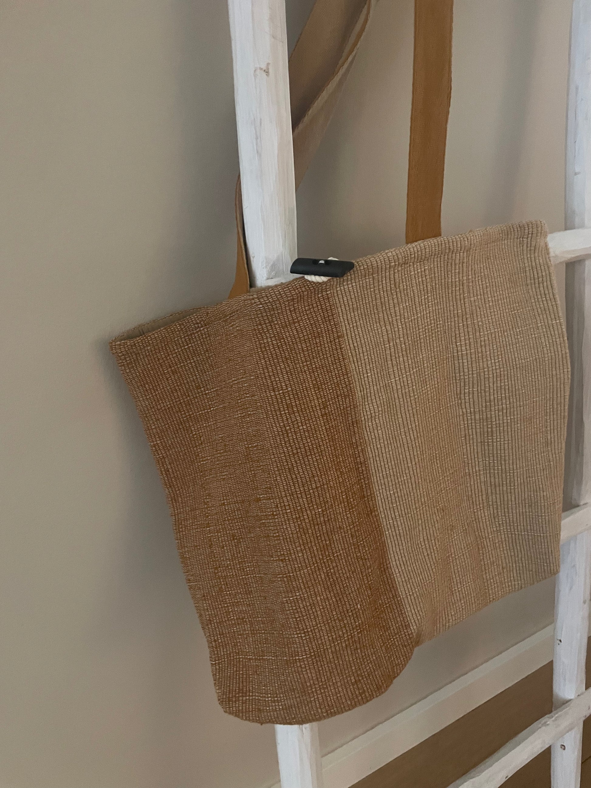Handgemaakte gevoerde tas van katoen met binnenvak en knoopsluiting. Ideaal om mee te nemen naar het strand, zwembad of om te gebruiken als boodschappentas.